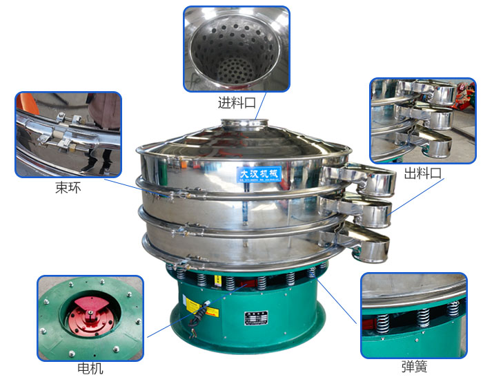 旋振篩主要由進(jìn)料口、防塵蓋、出料口、束環(huán)、篩網(wǎng)、配重塊、上部重錘、振動(dòng)體、振動(dòng)電機(jī)、彈簧、下部重錘、機(jī)座等部分組成。