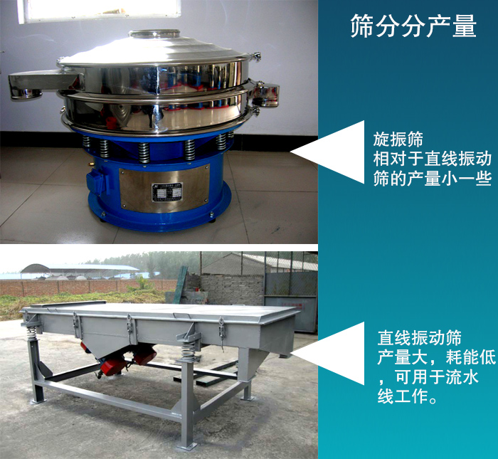 旋振篩相對(duì)于直線(xiàn)振動(dòng)篩的產(chǎn)量小一些,直線(xiàn)振動(dòng)篩產(chǎn)量大,耗能低,可用于流水線(xiàn)工作。