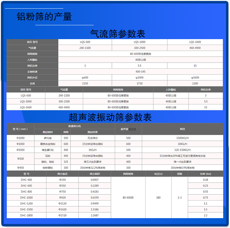 產(chǎn)量在很大程度上是振動(dòng)篩價(jià)格的決定因素,振動(dòng)篩的產(chǎn)量越高,其能夠在單位時(shí)間內(nèi)篩分出來(lái)的物料越多,工作效率越高,就能帶來(lái)更高的經(jīng)濟(jì)效益,所以鋁粉篩的價(jià)格是和所選的產(chǎn)量成正比的。詳情可參照超聲波振動(dòng)篩參數(shù)表和氣流篩參數(shù)表。