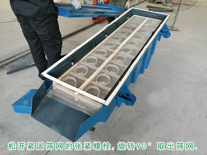 1)松開緊固篩網的張緊螺栓,不用講螺母完全卸下來,旋轉90°即可,使其從篩網鉤板的長孔中退出,取出篩網。