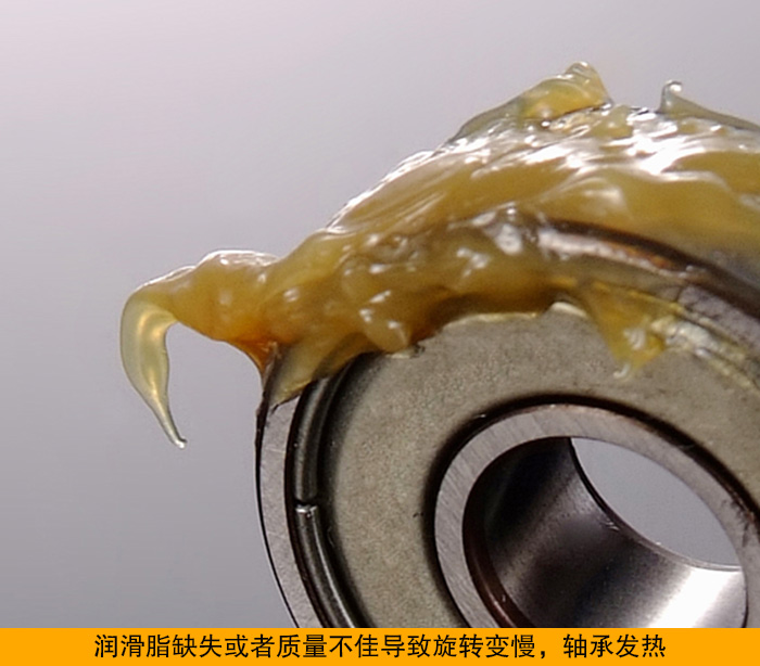 原因:維護(hù)和保養(yǎng)的頻率跟不上,軸承缺潤(rùn)滑脂,如果是新添加的油脂,要么是油脂的質(zhì)量問題,要么是加得太滿,劣質(zhì)油使軸承堵塞。